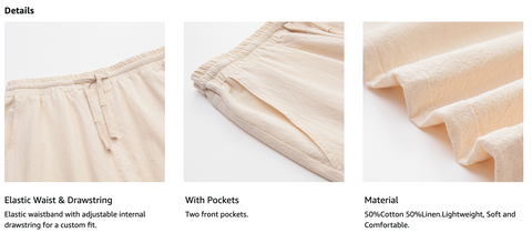 - Made of Linen blended fabric. Skin-friendly, breathable and moisture wicking, keep you cool and relaxed all the time especially in hot summer.