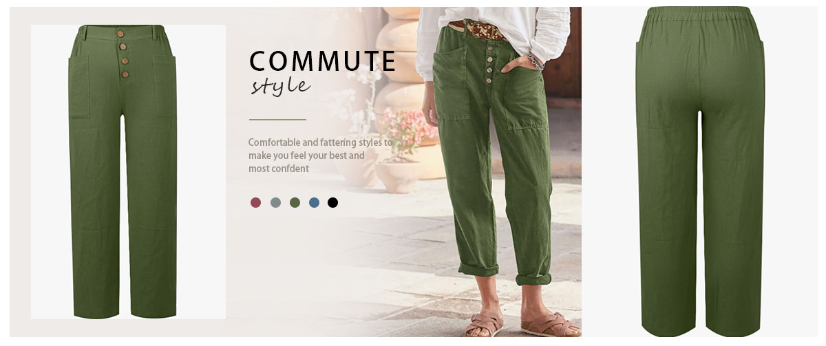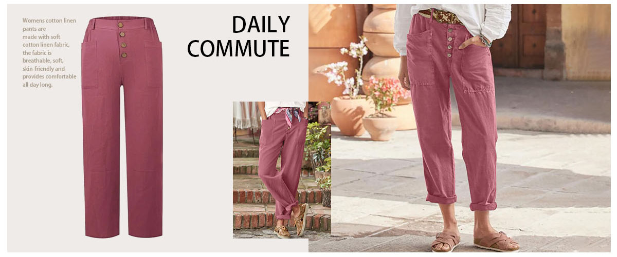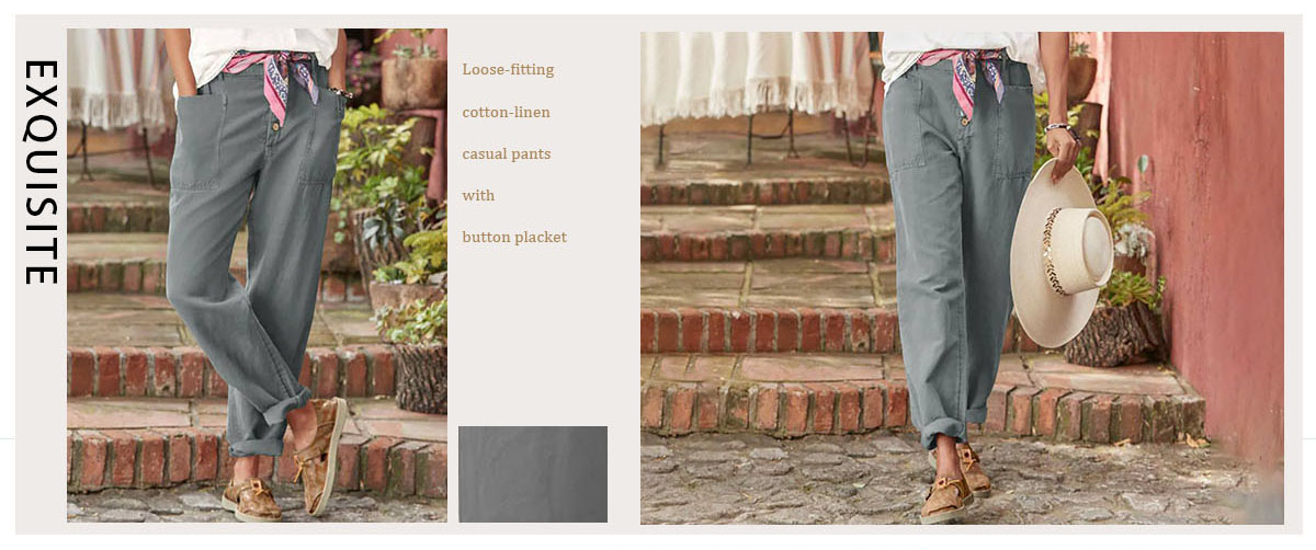 Loose-fit casual cotton-linen pants with row buttons