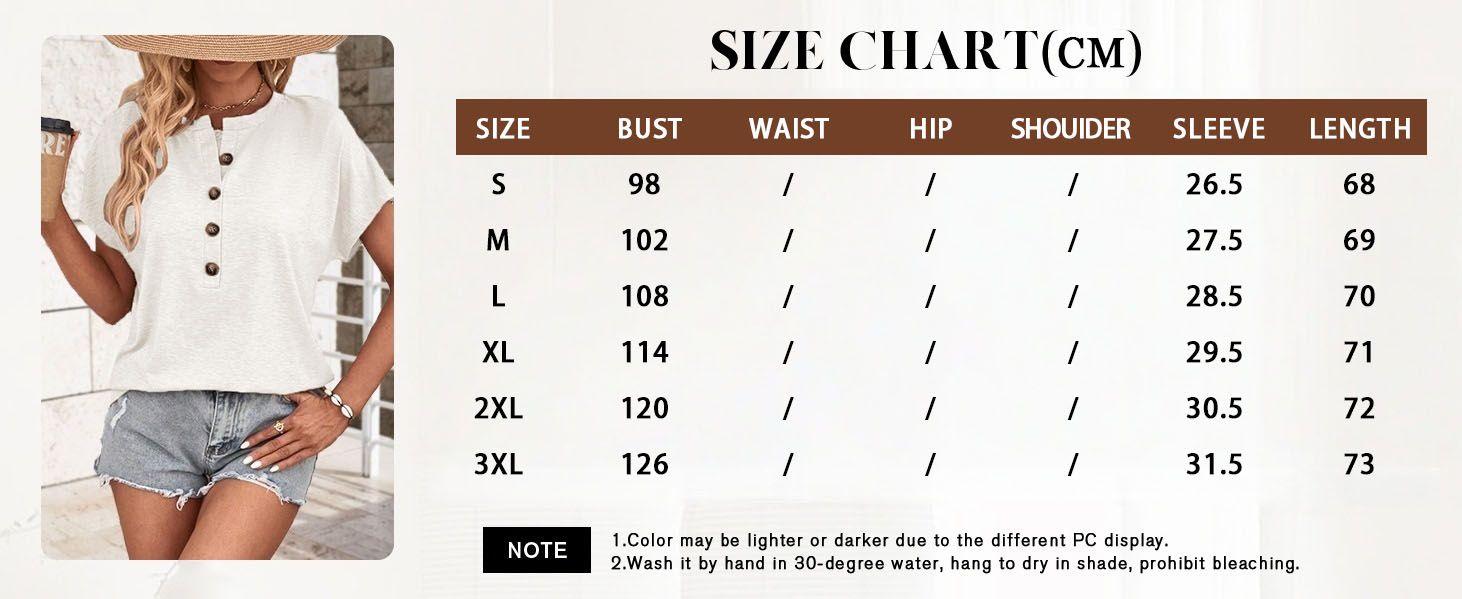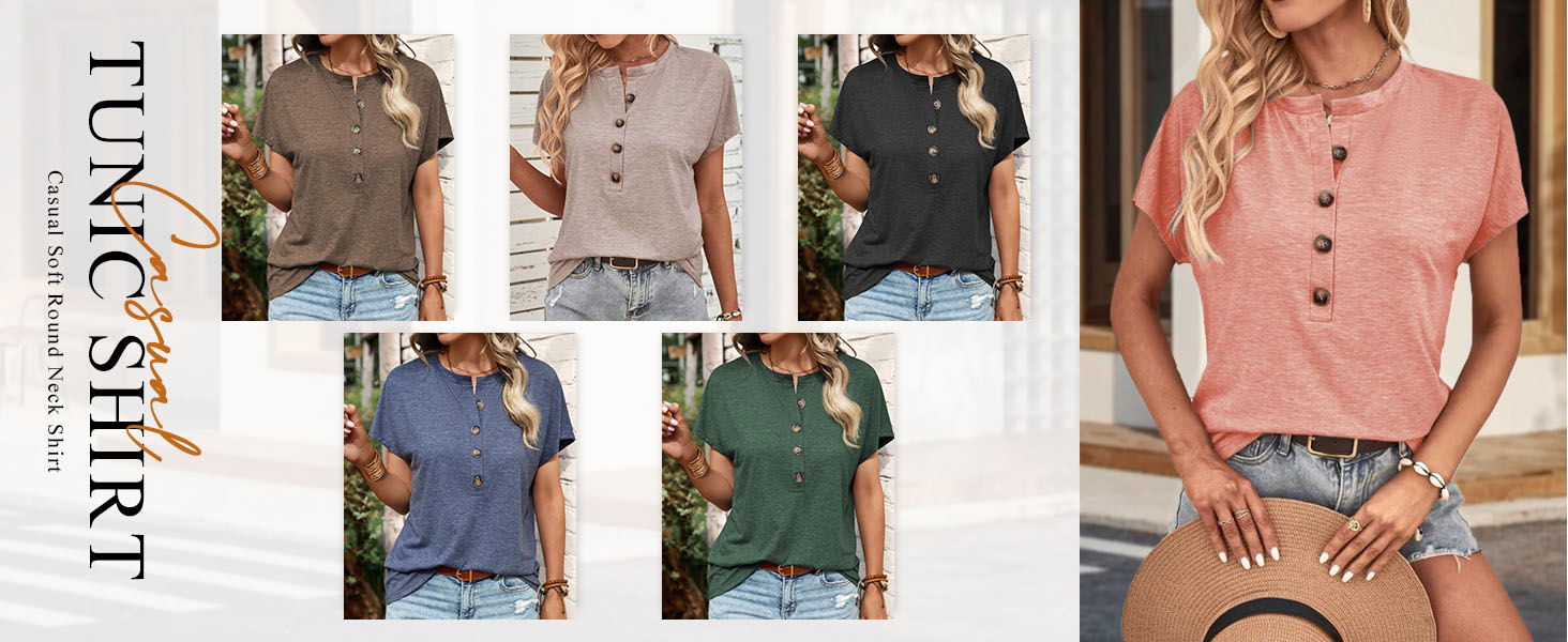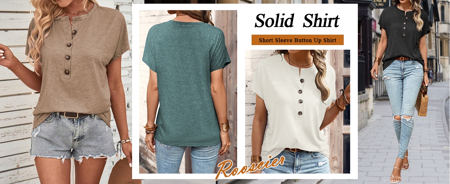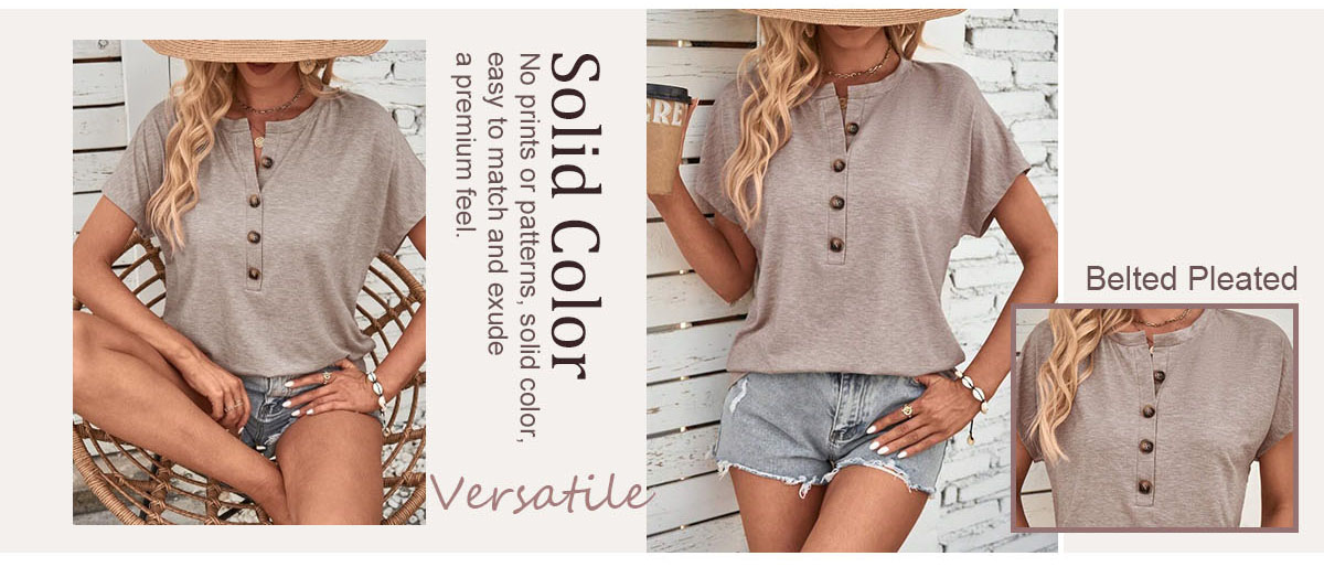 Simple & Timeless:Round neck, short sleeves, button detail, and a loose, relaxed fit for effortless style.