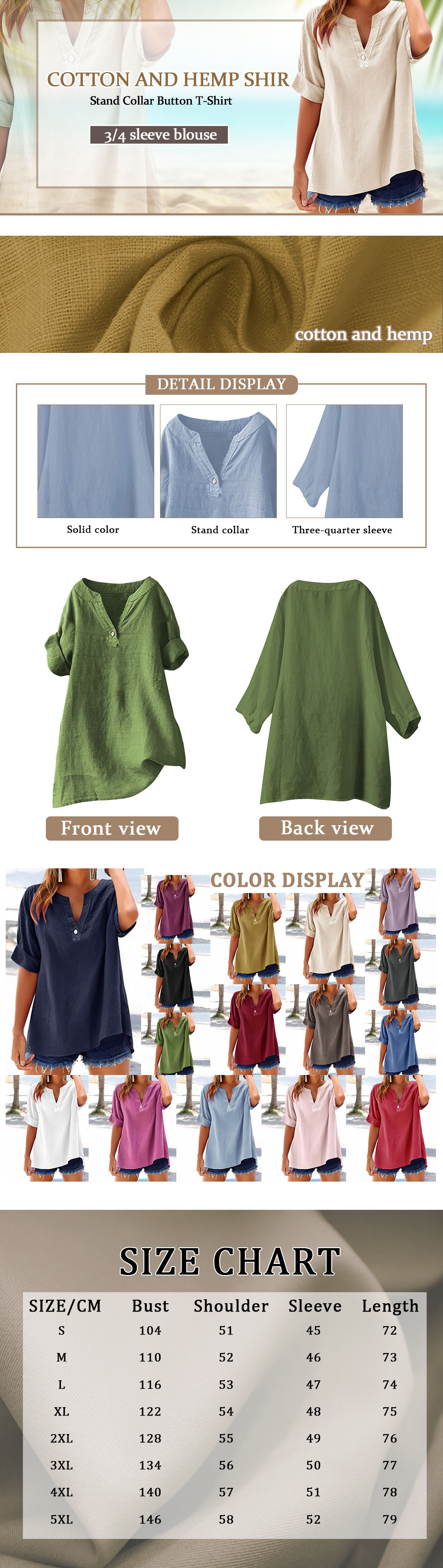 Women's Cotton-Linen 3/4 Sleeve Top – Stand Collar, Button-Up, Solid Color